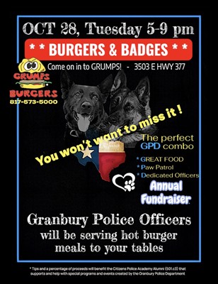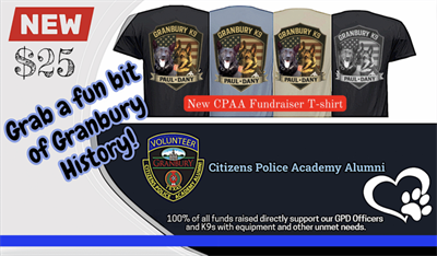 Feel free to stop by GPD and grab a little piece of Granbury history with a K9 Paul or K9 Dany MINI. We also have a K9 T-shirt. 100% of all funds donated/raised directly support your local GPD Officers & K9s with essential resources.  (https://cpaalumni.org)